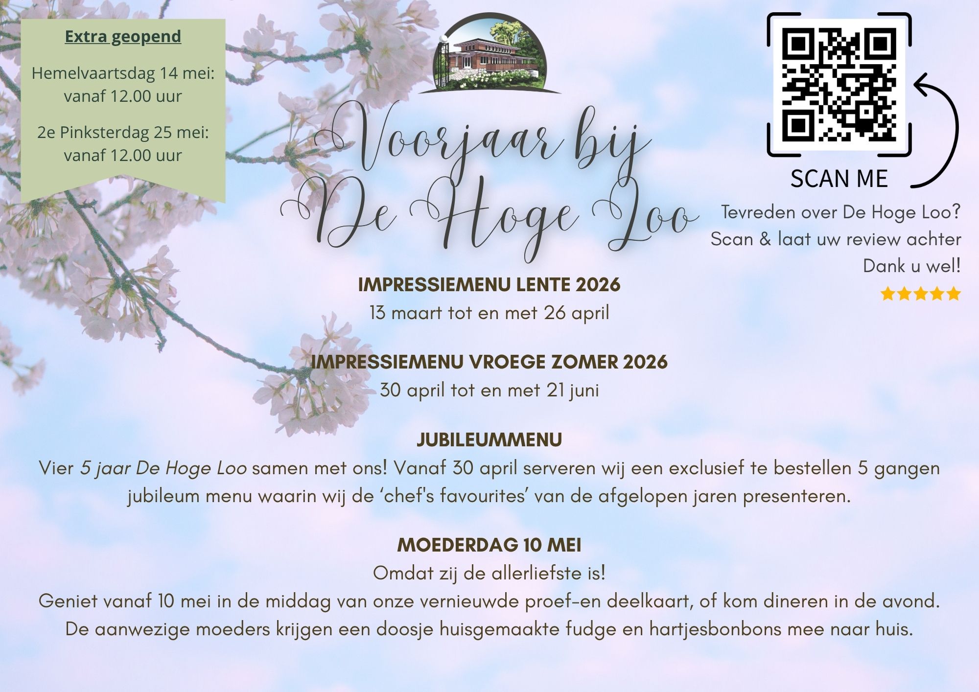 Bij De Hoge Loo verwelkomen wij u graag voor een culinaire beleving in een warme, natuurlijke omgeving. Te midden van de oude eiken van Landgoed Kraneven kunt u samen met uw gezelschap genieten van gastvrijheid en verfijnde gerechten. Onze chef Mike Kersten en sous-chef Momo Chaidam verrassen u met hun impressiemenu: een creatief palet van seizoensgebonden kwaliteitsgerechten, volledig huisgemaakt met oog voor detail en liefde voor het vak. Voor een uitgebreide toelichting op onze filosofie verwijzen wij u graag naar de subpagina ‘Concept’.